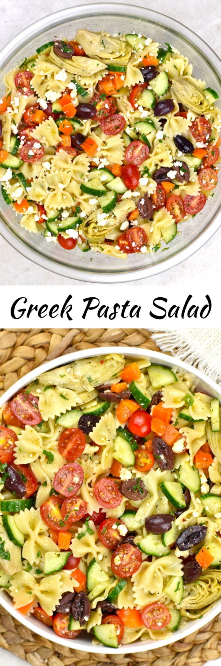 This Greek Pasta Salad is bright, fresh and full of Mediterranean flavor. Bowtie pasta tossed with cucumbers, tomatoes, olives, artichokes and feta in a light lemon vinaigrette. Perfect for potlucks, barbecues and easy summer meals.